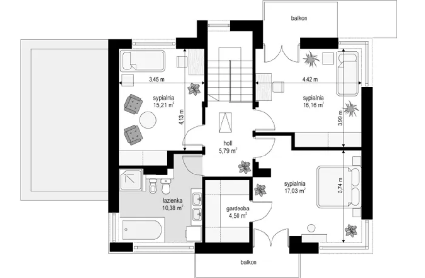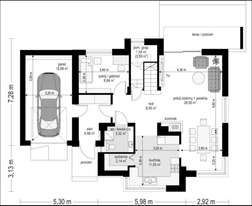 - Dach- konstrukcja drewniana imprenowana klasa C30, folia dachowa DELTA-XX plus, pełne deskowanie, pokrycie dachu panel na rąbek kolor antracyt.